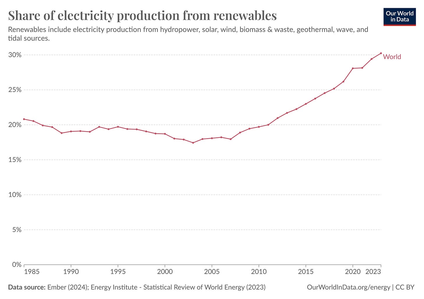 And so it would seem that 30% of the worlds electricity did indeed come from renewable sources in 2023. According to an article by Ritchie published today,