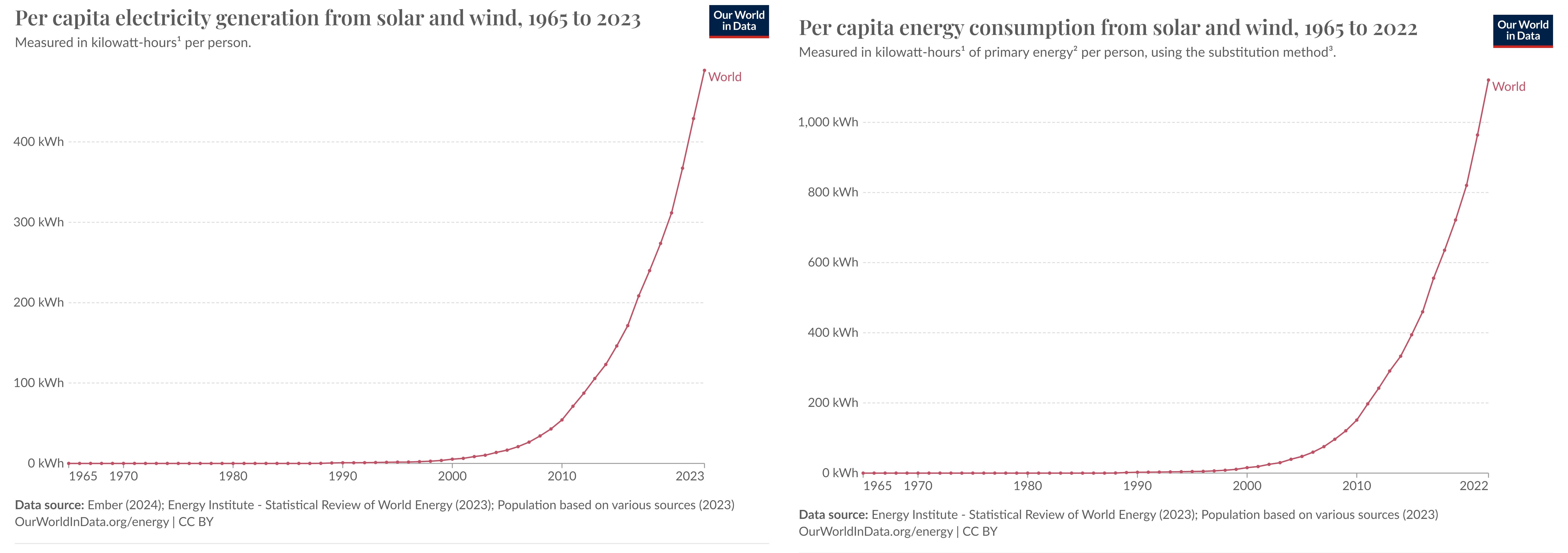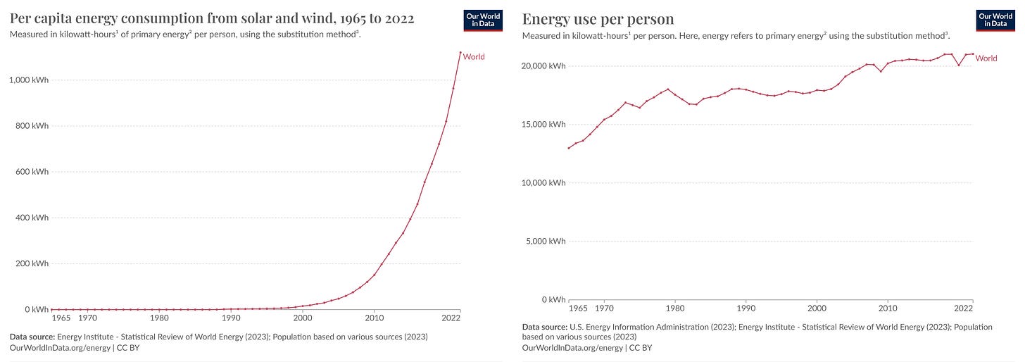 So has the 'rollout’ of wind and solar been rapid? I argue that Ritchie and the OWiD team are mistaken. The interannual variation of global consumption of coal, oil and gas is often greater than the entire production of either wind or solar, or both combined. Even when looking at just the electricity market, wind and solar look like fiddling around at the edges, rather than the emergence of a new infrastructure. They are no more rapid than were the expansion of coal and gas in the global electricity market as late at the 1990s — the era of climate policy-making — and yet create immense problems for grid management and costs for investors and consumers, as shall be discussed below.