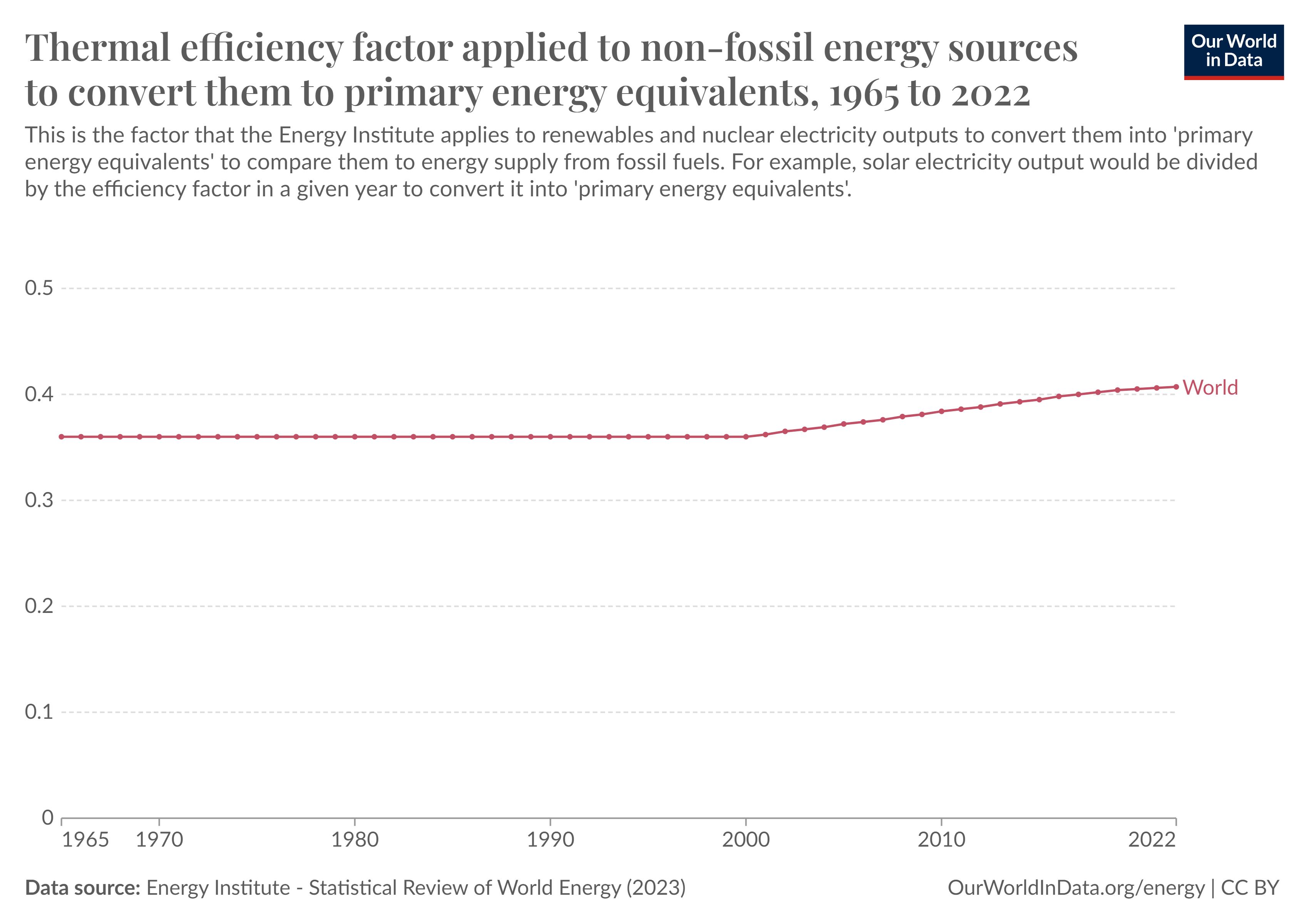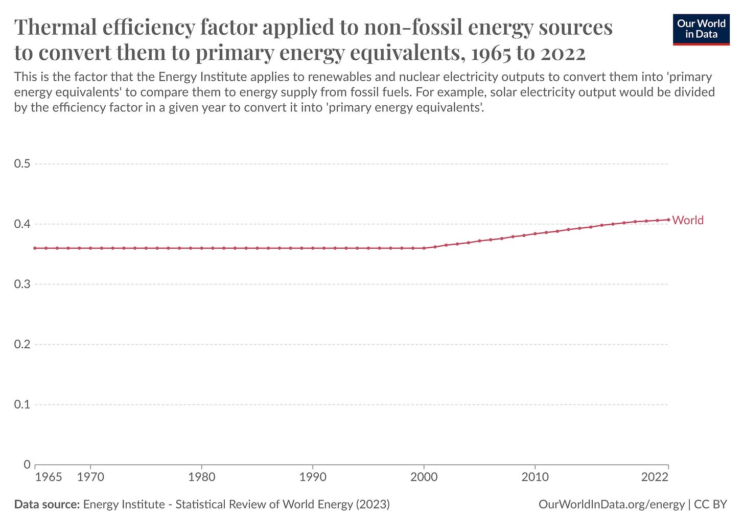 The ‘substitution method’ is used by researchers to correct primary energy consumption for efficiency losses experienced by fossil fuels. It tries to adjust non-fossil energy sources to the inputs that would be needed if it was generated from fossil fuels. It assumes that wind and solar electricity is as inefficient as coal or gas.