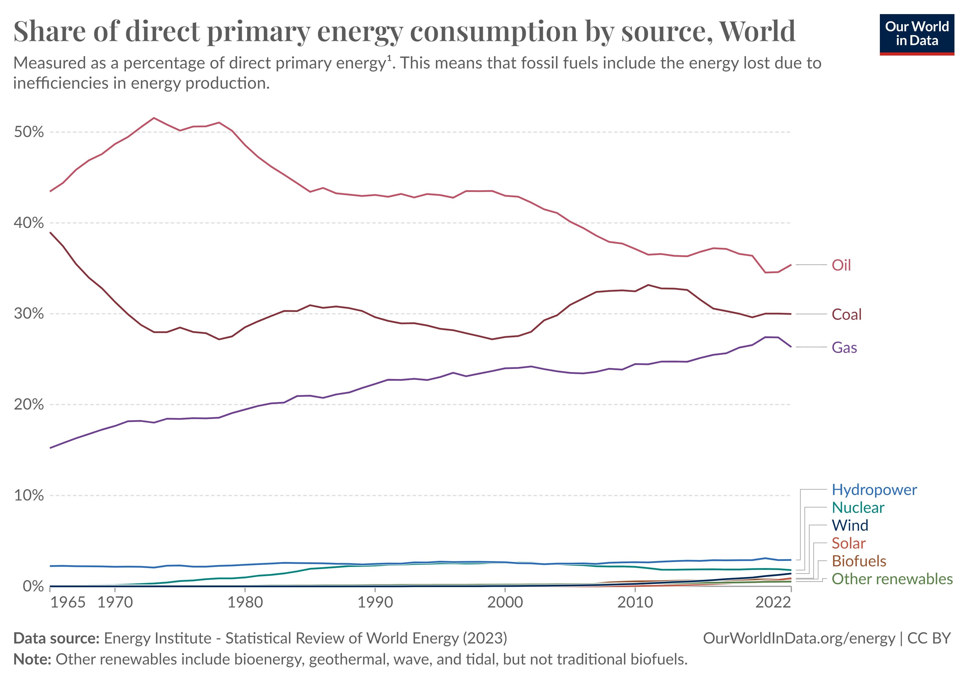 Nuclear power is also adjusted despite it also experiencing thermal losses in a power plant. Since it’s reported in terms of electricity output, we need to do this adjustment to calculate its equivalent input value.