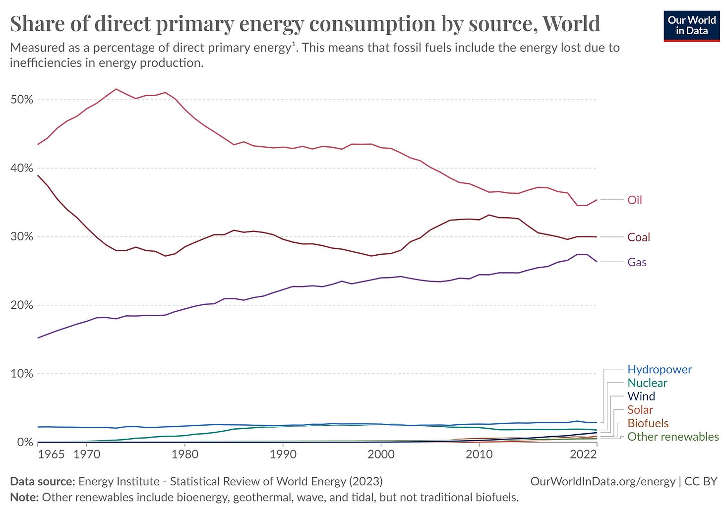 To ‘correct’ for these different methods of accounting, researchers can apply the ‘substitution method’. This tries to adjust non-fossil energy sources to the inputs that would be needed if it was generated from fossil fuels. It assumes that wind and solar electricity is as inefficient as coal or gas.