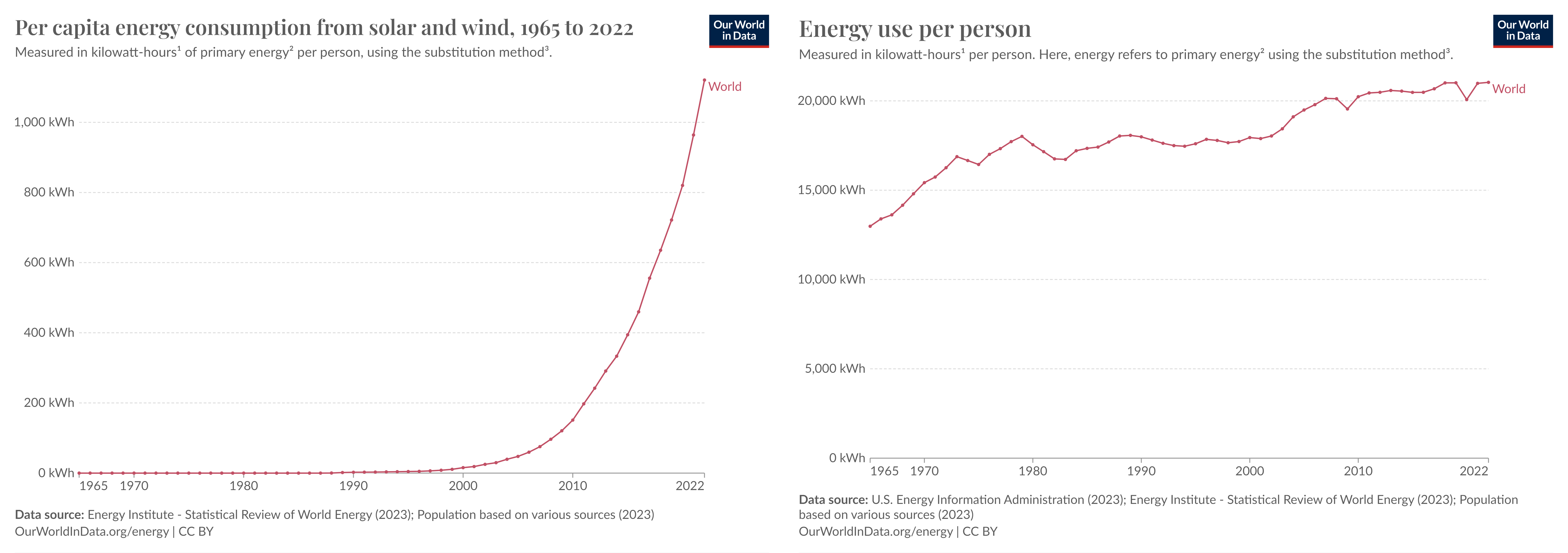 The difference between the two figures — 3.27 vs 1.41% — is the result of applying the ‘substitution method’ of energy accounting to the real data. The rationale of this data massaging is that, since generating electricity from combustion is inefficient — not all of the heat is converted into power — and whereas renewable sources such as wind power are 100% efficient, some compensating factor must be applied to give us a better picture. OWiD explain,