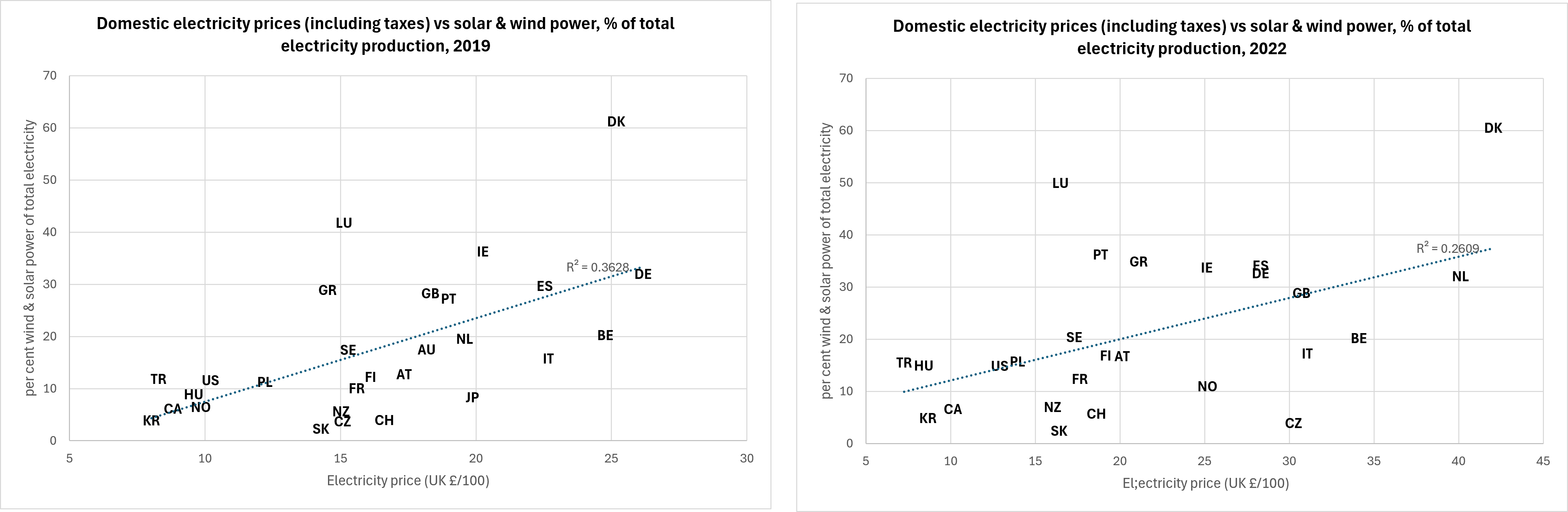 But the data is still useful. By obtaining from the UK government international comparisons of domestic energy prices (per kWh) and per-country data from OWiD on the ‘share of electricity production by source’, the following charts can be produced.