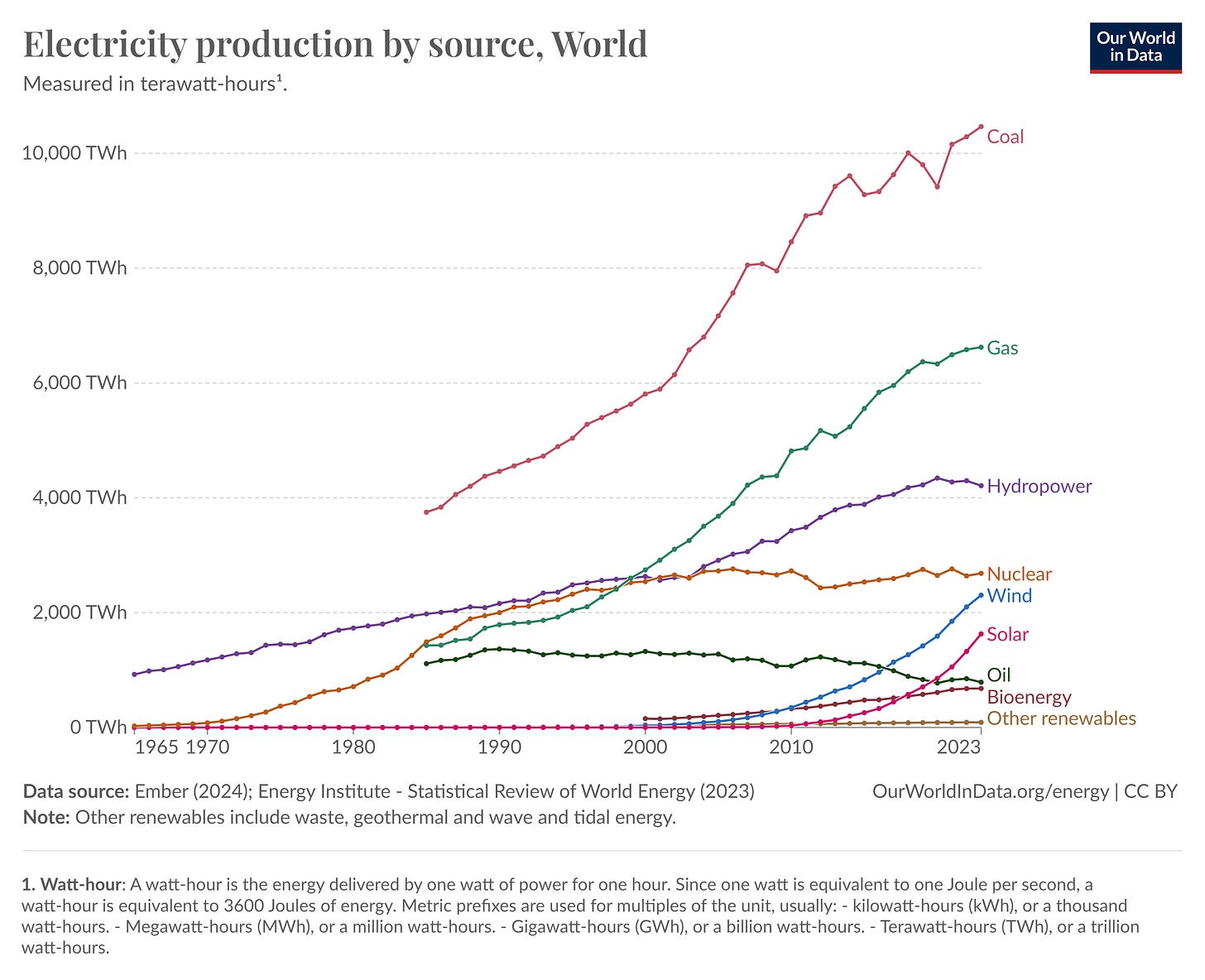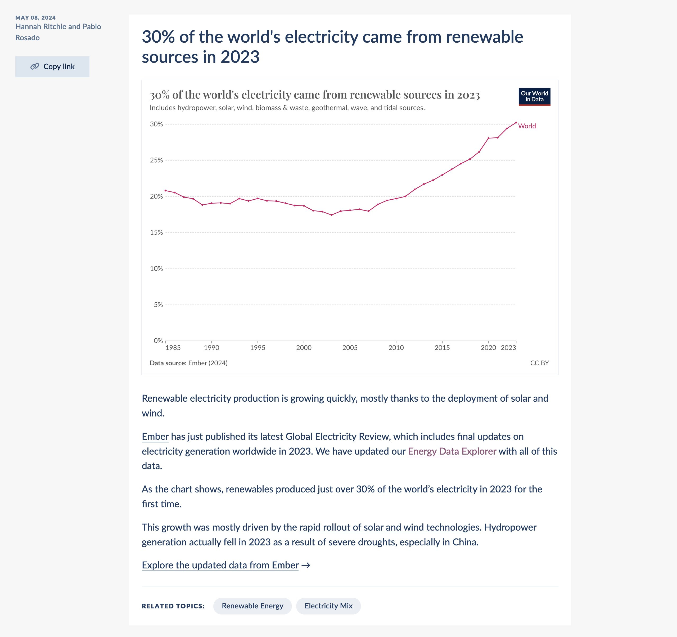 On Twitter/X this morning, Ritchie’s colleague and OWiD founder, declares that, for the first time, ‘30% of the world's electricity came from renewable sources in 2023’.