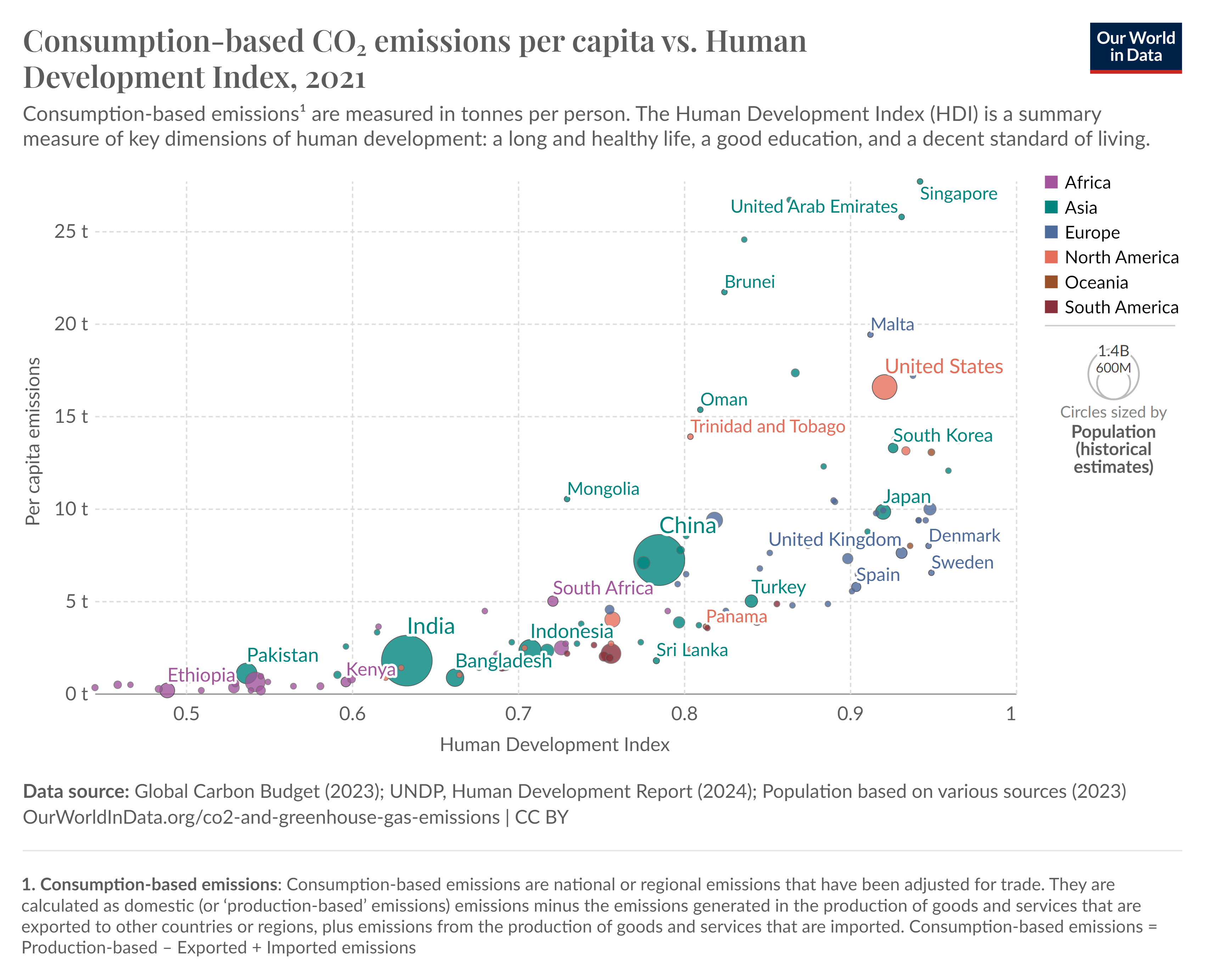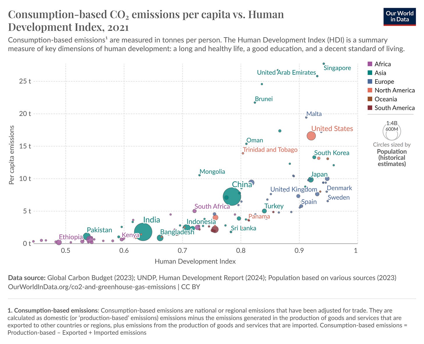 But instead, OWiD positions itself in the green camp, and for the most part, funnels its users towards an ideological, not data-driven understanding of climate and socoety’s relationship with it. And then its staff produce such crass broadsides against ‘deniers’ — people who might want to point out that the fundamental relationship between wellbeing and CO2 emissions is one worth understanding before it is radically altered.